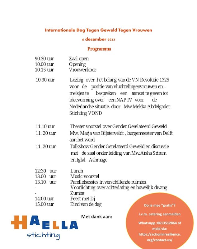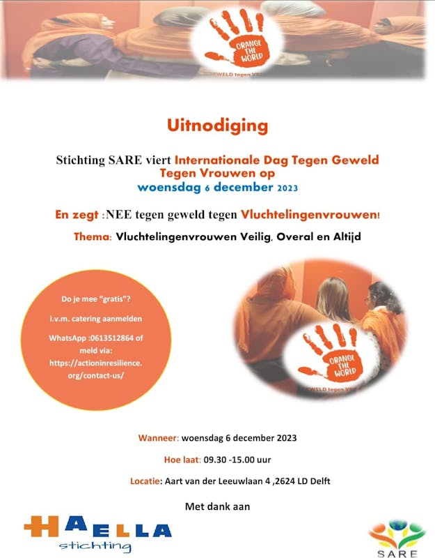 In het kader van de wereldwijde campagne Orange the World, stop geweld tegen vrouwen,organiseert Stichting SARE een evenement Vluchtelingvrouwen: VEILIG, OVERAL EN ALTIJD op woensdag 6 december in de vleugel wijkcentrum Delft.