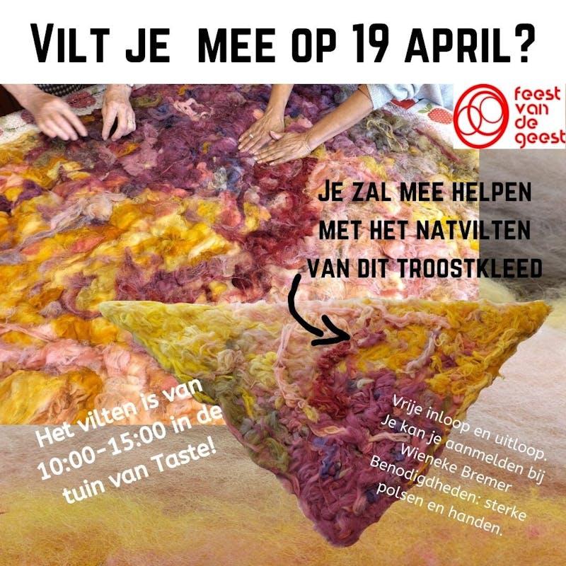 Het vilten is van 10-15 uur in de tuin van Taste. Je kunt vrij in en uitlopen. Aanmelden bij Wieneke Bremer