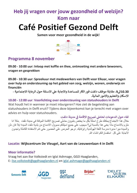 09.00 - 10:30 uur: Spreekuur met medewerkers van Delft voor Elkaar, voor vragen over hulp en ondersteuning op het gebied van zorg, welzijn, wonen, onderwijs en financiën