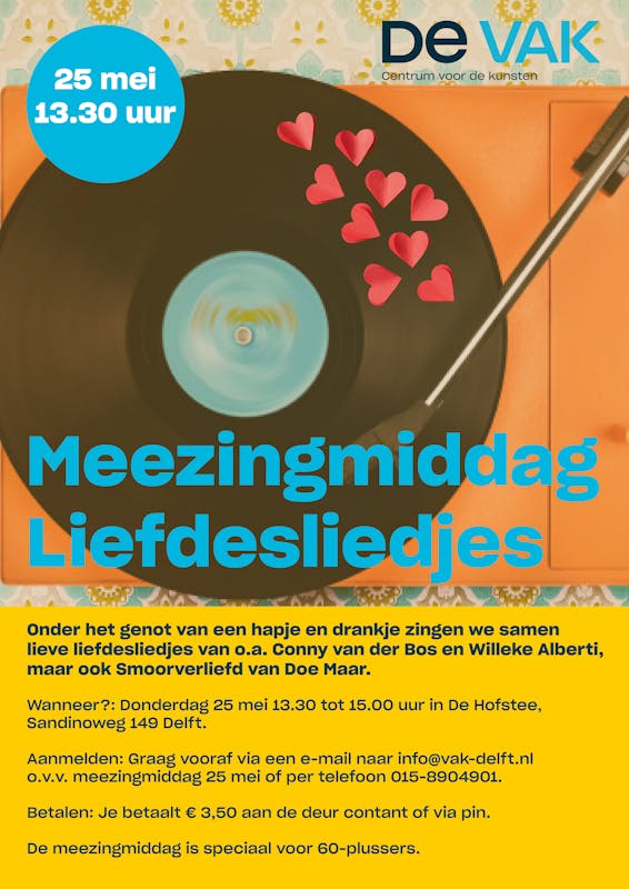 Aanmelden: Graag vooraf aanmelden via een e-mail naar onder vermelding van meezingmiddag 25 mei of per telefoon 015-8904901