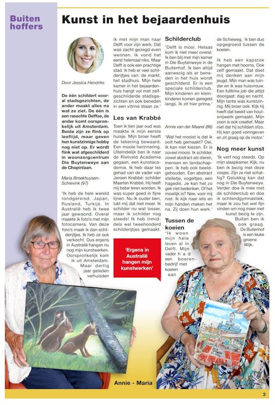 De één schildert vooral stadsgezichten, de ander maakt alles na wat ze ziet. De één is een rasechte Delftse, de ander komt oorspronkelijk uit Amsterdam. Beide zijn ze flink op leeftijd, maar geven hun kunstzinnige hobby nog niet op. Er wordt flink wat afgeschilderd door Maria Broekhuysen-Schievink (97) en Annie van der Maarel (86) in woonzorgcentrum Die Buytenweye aan de Chopinlaan. Lees de rubriek de Buitenhoffer(s) in de krant.